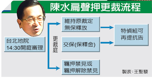 中新網(wǎng)12月18日電 據(jù)臺灣《聯(lián)合晚報(bào)》報(bào)道,臺灣特偵組今天(18日)與臺北地檢署連手聲押陳水扁,檢方上午擬出一套最高指導(dǎo)原則,即“以影響審判長周占春心證”為主,以“檢察官有監(jiān)督法官行使職權(quán)的義務(wù)”說理為輔,特偵組表示,若是仍無法說服合議庭收押陳水扁,將再提抗告。