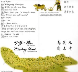 馬英九伉儷新年賀卡18日出爐,內(nèi)頁挑選橫躺的臺(tái)灣古輿圖以及水牛耕種圖做為圖樣。(臺(tái)灣“中央社”圖)