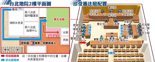 合議庭考慮吳淑珍身體狀況,預(yù)計(jì)這兩天各開(kāi)庭4小時(shí)。法院也開(kāi)放第八法庭給臺(tái)大醫(yī)院放置臨時(shí)病床、心電觀察儀器和呼吸器材,兩名醫(yī)師、兩名護(hù)士也可在此休息,法院外也將有救護(hù)車待命。由于臺(tái)大仍認(rèn)為吳淑珍不適合長(zhǎng)時(shí)間坐著,合議庭今將每30分鐘讓她休息一下,由醫(yī)護(hù)量心跳及血壓,她若有需要,可在被告席桌下擺一臺(tái)電暖器保暖。