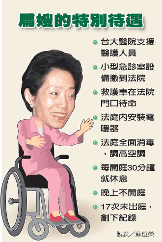 除了基本的醫(yī)療戒護(hù),臺北地院擔(dān)心長時間開庭,虛弱的吳淑珍會撐不住,每開庭30分鐘就休庭10分鐘,庭訊預(yù)計3小時,而且晚上不開庭,甚至在律師進(jìn)行答辯時,吳淑珍還可以到一旁的第八法庭稍作休息。這樣的高規(guī)格對吳淑珍,就是要讓審理過程更加順利。