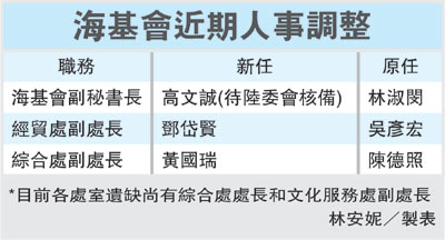 去年底,;鶗耸碌卣,包括綜合處、經(jīng)貿(mào)處、文化處在內(nèi)等“一正處長、二副處長”都未獲續(xù)任。近期被視為是海基會最后一位前朝人馬的林淑閔,日前離職,遺缺由高文誠遞補,這項新人事也待“陸委會”核備。