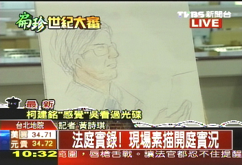 而在法庭內(nèi)的素描,坐在被告席上的陳水扁看來(lái)有些駝背,面前擺著一臺(tái)計(jì)算機(jī),所有對(duì)話都會(huì)在計(jì)算機(jī)中顯現(xiàn)出來(lái),在被告席左邊的是律師席,坐著陳水扁律師鄭文龍,而被告席正對(duì)面就是審判者蔡守訓(xùn),蔡守訓(xùn)一開始問(wèn)陳水扁是不是心跳加速、會(huì)氣喘?陳水扁連話都沒有說(shuō),只是點(diǎn)點(diǎn)頭,低頭看著計(jì)算機(jī)屏幕。