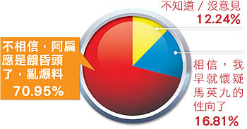 除此之外,臺(tái)灣《蘋果日?qǐng)?bào)》還做了民意調(diào)查,結(jié)果顯示,70.95%的臺(tái)灣受訪民眾認(rèn)為關(guān)于馬英九同性戀的說法是陳水扁餓昏了頭亂爆料,只有16.81的民眾表示相信此事。(韋博)
