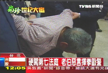 中新網(wǎng)2月26日電 據(jù)臺灣TVBS報道,陳水扁連續(xù)3天開庭,庭外依舊鬧哄哄,今天一名70多歲的老伯,在開庭后硬要闖入第七法庭,鬧場舉動引來法警關(guān)切,沒想到老伯面對人數(shù)眾多的法警,不但口出惡言,還出手打人,法警忍無可忍,最后強(qiáng)制執(zhí)行公權(quán)力趕人。
