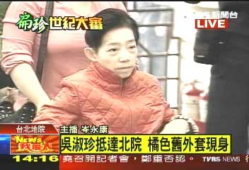 下午2點(diǎn)15分,吳淑珍穿著橘色舊外套,在兒子陳致中及陳水扁高中同學(xué)吳文清陪伴下,抵達(dá)臺北地方法院,進(jìn)入法院后還用手遮住,打了一個(gè)呵欠;雖然場外還是有挺扁和反扁民眾聚集叫囂,但人數(shù)明顯比前幾次減少了。