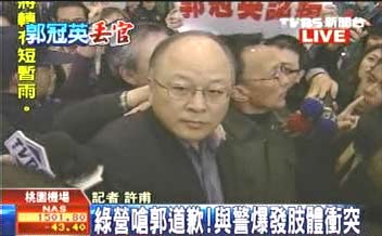 出關(guān)后,臉部表情略顯蒼白、鐵青的郭冠英,面對現(xiàn)場兩派人馬包圍、抗議的聲浪,并未再度發(fā)表談話,并在黑衣人簇?fù)硐,搭上座車離開機(jī)場。