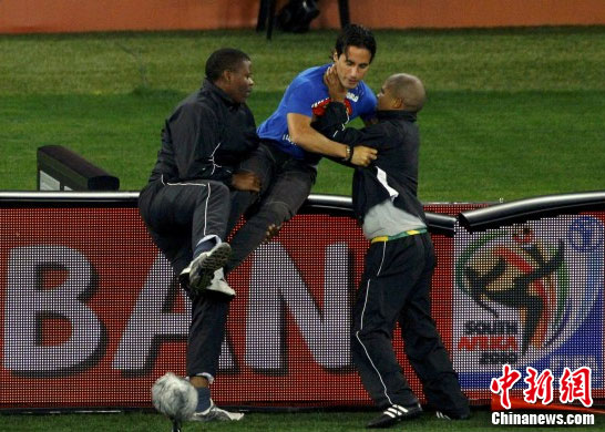 這已經(jīng)不是南非世界杯上首起賽場闖入事件了。在6月21日墨西哥與烏拉圭的比賽中,一對墨西哥兄弟和一名美國球迷就成功的闖入了球場,不過他們只是隨后被法庭處以500蘭特(約合66美元)的罰款。