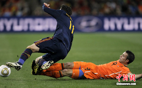 中新網(wǎng)7月12日電 今天凌晨2:30,南非世界杯迎來了最終的決賽,由荷蘭隊在約翰內斯堡的足球城球場對陣西班牙。最終雙方經(jīng)過120分鐘鏖戰(zhàn),由伊涅斯塔在第116分鐘攻入唯一一粒進球,絕殺十人應戰(zhàn)的荷蘭隊,史上首次奪得冠軍。
