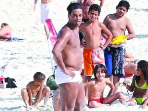 因為此前AC米蘭一直對他能否留隊舉棋不定,世界杯又被鄧加拋棄,小羅只好自己去尋開心,他先是相約帕托等人在奢華酒店享受,隨后又到里約熱內(nèi)盧沙灘玩耍。只是他忘了給自己的大肚腩遮羞,臃腫的身材似乎正在向大羅看齊。