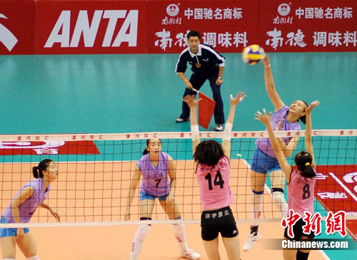 中新網(wǎng)漯河8月1日電 (記者 師紅壘 通訊員 林波)7月31日上午,2010年全國女排錦標(biāo)賽(雙匯賽區(qū))在漯河市體育中心體育館進(jìn)行了交叉賽的4場較量,東道主河南隊(duì)0:3不敵缺席多名國手的全國女排聯(lián)賽七冠王天津隊(duì),江蘇3:0戰(zhàn)勝遼寧,山東3:1擊敗云南,廣東0:3負(fù)于河北。四場比賽的具體比分是:天津-河南(25:16、25:16、25:11);江蘇-遼寧(25:21、27:25、25:18);山東-云南(25:21、20:25、25:19、25:21);廣東-河北(8:25、23:25、12:25)。