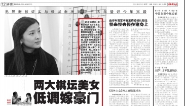 新結婚時代,即便是仙女下凡也還是向往婚姻殿堂。昨日,某專業(yè)報報道,中國圍棋雙姝之一的毛昱衡已與中超杭州綠城老板宋衛(wèi)平登記結婚,記者隨即通過多方證實,這位棋壇美女早在去年12月就已登記,嫁入豪門,不出意外,兩人將在今年年底舉辦婚禮。此前,雙姝之一的圍棋美女唐莉也被爆與神秘富豪完婚,并且已懷有身孕,深入簡出的唐莉已在家安心養(yǎng)胎。兩位棋壇最美嫁的嫁,婚的婚,留給棋迷一聲嘆息。