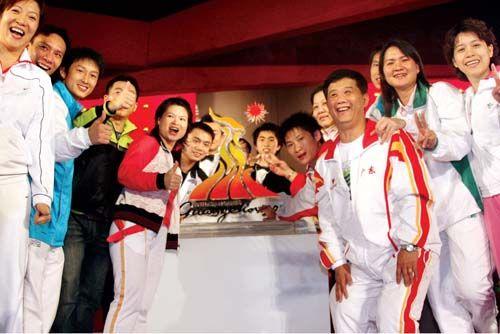 廣東著名體育人士在揭曉的第16屆亞運(yùn)會(huì)會(huì)徽的展板前留影