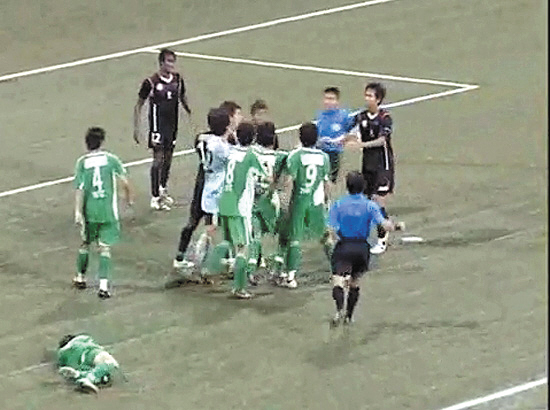 其實(shí)從上半場開始,兩隊(duì)球員你來我往,態(tài)度強(qiáng)硬,互不相讓,已經(jīng)隱約讓人感覺到一絲火藥味。到了下半場,雙方的動(dòng)作越來越粗野。第88分鐘,場上比數(shù)為1比1時(shí),北京國安隊(duì)的5名球員突然包圍幼獅隊(duì)的一名球員。接著,兩隊(duì)的球員紛紛沖進(jìn)球場,彼此拳打腳踢打成一團(tuán)。
