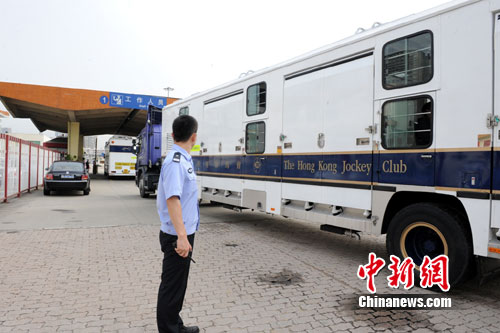 10日清早7時(shí)40分,香港賽馬會(huì)的兩輛粵港兩地牌貨車(車內(nèi)運(yùn)有18匹賽馬)和6輛隨行保障車由香港經(jīng)皇崗口岸入境,皇崗邊檢站警戒隊(duì)按預(yù)案要求,派警車從橋頭將運(yùn)馬車輛一行安全引帶至貨檢入境查驗(yàn)場(chǎng)地?吭谥付ǖ呐R時(shí)候檢區(qū)域,并擔(dān)負(fù)警戒監(jiān)護(hù)工作。在檢驗(yàn)檢疫部門(mén)進(jìn)行消毒的同時(shí),貨車檢查隊(duì)、小(客)車檢查隊(duì)的民警立即聯(lián)動(dòng),高效、快捷、優(yōu)質(zhì)的為入境機(jī)動(dòng)車司機(jī)、馬童及隨行人員共33人的證件辦理查驗(yàn)手續(xù)。8時(shí)50分,運(yùn)馬車輛及隨行人員離開(kāi)皇崗口岸前往廣州亞運(yùn)馬術(shù)場(chǎng)。