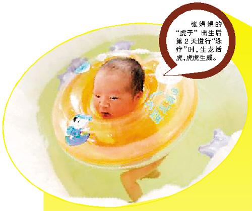 張娟娟的“虎子”出生后第2天進行“泳療”時,生龍活虎,虎虎生威。