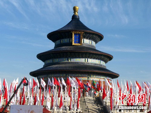 據(jù)現(xiàn)場工作人員介紹,每棒火炬手傳遞距離為50米,16名火炬手分別在天壇公園內(nèi)指定傳遞交接點依次進行火炬?zhèn)鬟f,同時播放火炬?zhèn)鬟f主題曲《傳遞愛》。