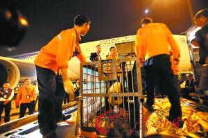 廣州日?qǐng)?bào)10月28日?qǐng)?bào)道 23時(shí)58分,第一批兩只熊貓寶寶津柯和博斯同時(shí)被運(yùn)下飛機(jī),2分鐘后就被裝上了前來迎接它們的車輛。其余4只熊貓?jiān)诘诙黄鹣铝孙w機(jī),所有熊貓寶寶在今日凌晨0時(shí)10分裝車完成,被送往香江野生動(dòng)物園。