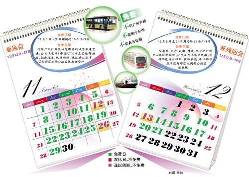 根據相關規(guī)定,在亞運會及亞殘運會機動車單雙號限行的46天里(11月1日至29日、12月5日至21日),剔除13個雙休日和3天新增假期后的30個工作日里,市民都可免費享受公共交通服務。有關部門預計,免費期間廣州每天將新增300萬人次的客流,高峰期可能出現“井噴”,請沒有剛性出行需求的市民注意錯峰出行。