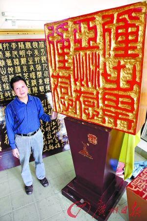 廣州日?qǐng)?bào)11月4日?qǐng)?bào)道(文/圖記者李立志)在廣州番禺有一位奇人郭勁帆,花了兩年時(shí)間精心制作的篆雕作品——高2.1米,寬1.3米的“亞運(yùn)巨印”。亞運(yùn)前夕,他想將這個(gè)可能是世界上最大的印章獻(xiàn)給亞運(yùn)會(huì)。