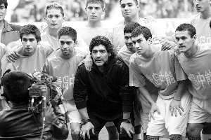 按照此次溫暖中國(guó)行的計(jì)劃,馬拉多納帶領(lǐng)的阿根廷隊(duì)將與李明領(lǐng)銜的山東國(guó)腳進(jìn)行一場(chǎng)義賽,所得款項(xiàng)捐獻(xiàn)給中國(guó)紅十字基金會(huì),屆時(shí)老馬將會(huì)親自登場(chǎng)比賽。下午14時(shí)30分左右,奧體中心體育場(chǎng)已經(jīng)坐了一大半球迷,有人穿著阿根廷國(guó)家隊(duì)的藍(lán)白球衣,有人舉著紀(jì)念圍巾。球場(chǎng)上兩支隊(duì)伍在熱身,并不見主角馬拉多納的影子,工作人員稱他還在飛機(jī)上。