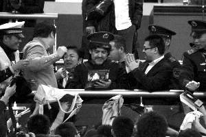 簽名、繞場(chǎng)一周、顛球、演講……馬拉多納用盡了招數(shù)也沒能取悅昨日來濟(jì)南奧體中心觀看比賽的球迷,因?yàn)樗麄兌际菦_著“老馬保證登場(chǎng)不少于20分鐘”這個(gè)噱頭而來,但是球王并未如約展示球技。