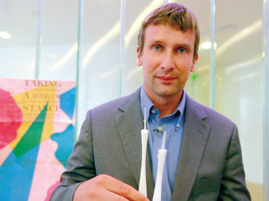 11月14日晚,廣州新電視塔頂層,在這個(gè)尚未開放的區(qū)域,這座“小蠻腰”的設(shè)計(jì)師馬克(MARK HEMEL,見(jiàn)上圖)接受了羊城晚報(bào)記者專訪。馬克的記憶,還停留在亞運(yùn)開幕式那晚電視塔璀璨奪目的那刻,他既驚嘆又感慨,連連稱:“‘女兒’終于出閣了!”