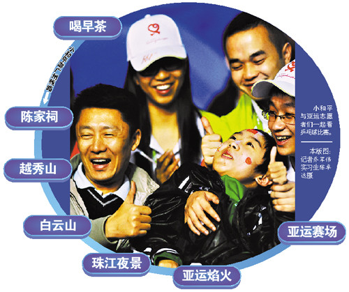 喝早茶、逛陳家祠、在五羊雕塑下照全家!驮趤嗊\(yùn)開(kāi)幕當(dāng)天,由本報(bào)發(fā)起的“圓夢(mèng)愛(ài)心團(tuán)”帶著來(lái)自四川的絕癥少年小和平游廣州、嘗美食。昨天早上,在愛(ài)心團(tuán)的陪護(hù)下,小和平又來(lái)到離醫(yī)院最近的廣州體育館,觀看中國(guó)隊(duì)與伊朗隊(duì)的乒乓球男雙比賽,這是他第一次現(xiàn)場(chǎng)看球賽。