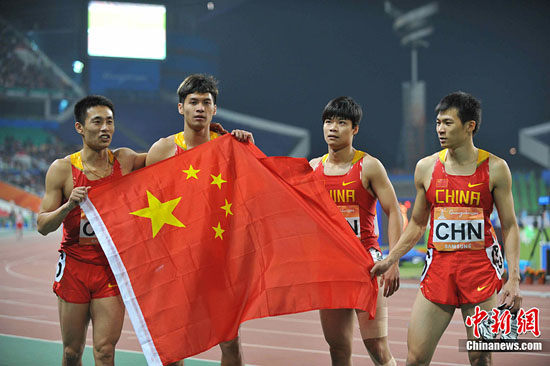 中新網(wǎng)11月26日電 在26日晚結(jié)束的廣州亞運(yùn)會(huì)田徑男子4x100米接力決賽中,新科亞洲“百米王”勞義與陸斌、梁嘉鴻和蘇炳添組成的中國隊(duì)以38秒78的歷史最好成績(jī)奪得冠軍,20年之后再次奪得亞運(yùn)會(huì)接力冠軍。