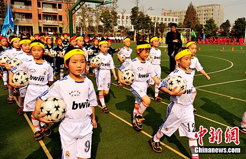 下午,陽光燦爛。來自10所小學(xué)的300名女足小隊員身著球衣和運動裝,各自抱著一個足球整齊列隊出場。稚氣的臉配上氣勢十足的口號,讓人感到格外意氣風(fēng)發(fā)。