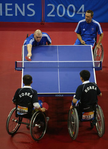 乒乓球殘疾人比賽在比賽的類型上有站立和輪椅兩大種類;在比賽的形式上有單打和雙打;在比賽的項目上有團體和單項。
