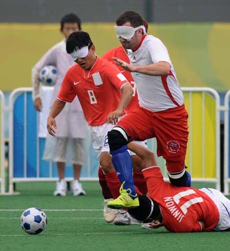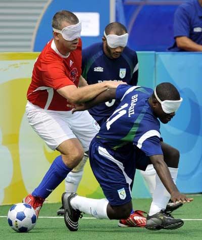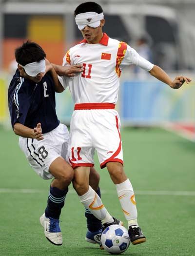 由于隊員視力問題,比賽中隊員只能依靠球發(fā)出的聲響來判斷球的位置,所以經常會出現(xiàn)隊員找不到球的情況。在進攻方向上還經常要依靠引導員的幫助,隊員間的呼應較多,所以攻防速度沒有普通的五人制足球快,傳接球次數(shù)相對也較少,烏龍球出現(xiàn)會多一些。 (來源: 亞殘運會官方網(wǎng)站)