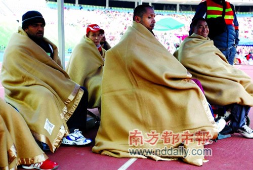 在男子鐵餅F32/33/34賽場上,運動員們每人都用一張棕色毛毯緊緊地包裹著身子,遠遠望去,如一排圓滾滾的小浣熊。鐵餅比賽共有15人參加,一場比賽下來時間需要一個多小時,因此亞殘運會組委會特意給每位運動員派發(fā)了一條毛毯,幫他們在等待自己比賽過程中保持體溫。
