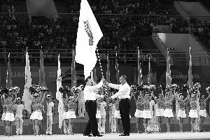 下一站,天津 閉幕式上,國家體育總局局長劉鵬(右)將中華人民共和國運(yùn)動會會旗交給天津市市長黃興國。第十三屆全運(yùn)會將于2017年在天津舉行。新華社發(fā)