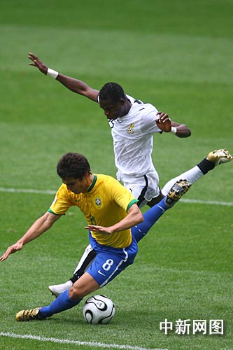 比賽開始后巴西隊并沒有急于大舉壓上進攻,第14分鐘加納獲得任意球機會,阿多的頭球被塞薩爾神勇?lián)涑,力保巴西城門不失。第16分鐘巴西獲得角球,卡卡前點擺渡,效力俄羅斯莫斯科中央陸軍的前鋒瓦格納墊射破門,幫助巴西1-0領(lǐng)先。隨后比賽雙方互有攻守,但都沒有進球,上半場比賽結(jié)束,巴西1-0領(lǐng)先加納。