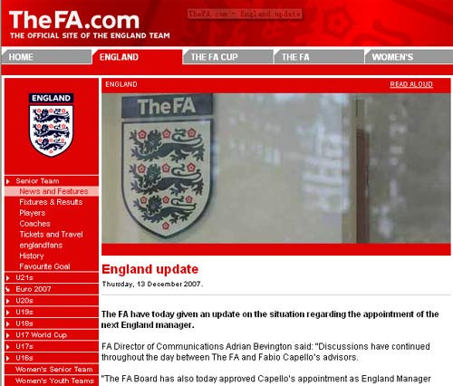 中新網(wǎng)12月14日電 萬(wàn)眾聚焦的英格蘭選帥今天終于接近水落石出,英格蘭足總今天凌晨在其官方網(wǎng)站上透露了選帥的最新進(jìn)展,卡佩羅入主已基本定局。