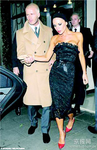 夫唱婦隨,維多利亞的穿著打扮也同樣的老氣橫生。當(dāng)晚維多利亞穿了一件鑲嵌蕾絲邊的連衣裙,腰間別了個(gè)蝴蝶結(jié),頭發(fā)盤起,頭上戴著黑色頭箍,臉上的妝依舊畫得很濃,還穿了雙紅色高跟鞋。不知道是擦得粉太重,還是新年活動(dòng)過于忙碌而體力透支,鎂光燈下的“辣妹”一臉慘白形像老態(tài)。英媒體諷刺這身打扮超出了她33歲的年齡,看起來簡(jiǎn)直可與丑劇大師馬塞歐比肩。(記者劉大偉)