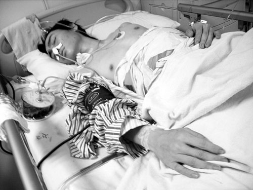 12月9日上午,記者在中國(guó)醫(yī)科大學(xué)附屬第一醫(yī)院重癥監(jiān)護(hù)室,看到身受重傷的王某仍躺在病床上接受著治療。據(jù)王某的母親介紹,王某今年22歲,原是遼寧某足球隊(duì)一名球員。今年年初時(shí),因?yàn)榧抑薪?jīng)濟(jì)條件不是太好,再加上外面還有許多債務(wù),無(wú)力供王某繼續(xù)踢球,王某被迫從球隊(duì)回到家中。眼下,家中正托人幫著孩子尋找工作,可工作沒(méi)有找著孩子便出了事。