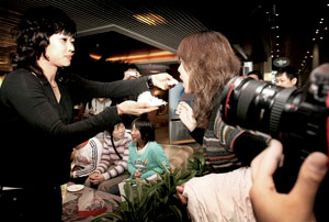 “粽子”們的舉動(dòng)讓韓端激動(dòng)得不知說什么才好。她拿起小刀切開蛋糕發(fā)給“粽子”和記者。“來,我們以蛋糕代酒,感謝你們對(duì)我的支持!”韓端說著給在場(chǎng)的人喂蛋糕。