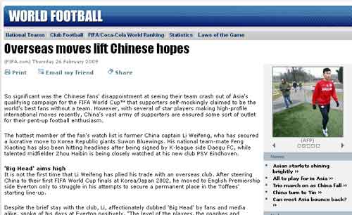 國際足聯(lián)官方網(wǎng)站昨天以《海外球員重燃中國足球希望》為題,對中國足壇新一代“留洋潮”進(jìn)行了報(bào)道。文章稱,自國足無緣南非世界杯之后,中國球迷們承受了巨大的失望。他們自嘲是“世界上最好的球迷”,但沒有匹配的球隊(duì)。然而,隨著幾名球員最近再度走出國門,中國球迷們的熱情再度被調(diào)動(dòng)。