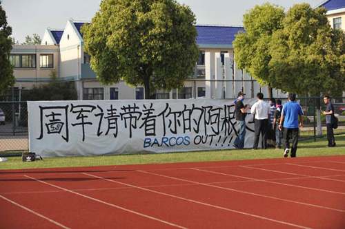 由于7日是申花的訓(xùn)練開放日,因此這幾名球迷進入基地一開始并未引起大家的注意,不過當他們試圖在申花宿舍樓對面的鐵絲網(wǎng)展開這個橫幅時,俱樂部工作人員趕緊進行了阻攔,并將他們“友好”的請出了基地。