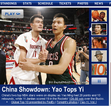 賽后,姚明和易建聯(lián)擊掌致意,這場(chǎng)中國(guó)德比也以中國(guó)球員的出色表現(xiàn)而收?qǐng)觥6诒荣惤Y(jié)束不久,NBA官方英文主網(wǎng)站在第一時(shí)間將易建聯(lián)的頭像放在顯要的位置,并介紹了這場(chǎng)中國(guó)球員之間的“攤牌”。