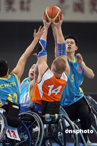 國際輪椅籃球邀請賽中國男隊無力阻擋荷蘭男隊進(jìn)攻。