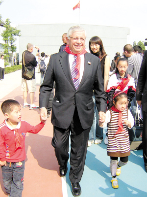 昨天下午,大衛(wèi)·斯特恩率領(lǐng)騎士眾星出現(xiàn)在上海閔行區(qū)的魯冰花農(nóng)民工小學(xué),NBA為這所學(xué)校捐建了一個(gè)籃球場(chǎng)、一個(gè)電腦室和一個(gè)圖書(shū)室,大衛(wèi)·斯特恩親自為這些康樂(lè)中心剪彩。在兩個(gè)小學(xué)生的牽引下,戴著紅領(lǐng)巾的大衛(wèi)·斯特恩滿(mǎn)面春風(fēng),看到孩子們?cè)缇妥诨@球場(chǎng)上等他到來(lái),斯特恩高興地向孩子們揮手致意。