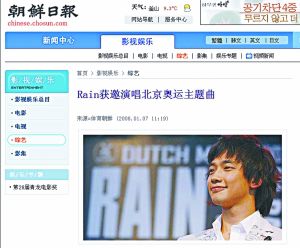 據(jù)前日的《朝鮮日?qǐng)?bào)》報(bào)道稱,韓國(guó)藝人Rain(鄭智熏)獲邀演唱北京奧運(yùn)主題曲。朝鮮日?qǐng)?bào)報(bào)道稱:“據(jù)悉,北京奧委會(huì)2007年曾向Rain發(fā)出邀請(qǐng),希望他能夠演唱奧運(yùn)主題曲。……Rain欣然接受了邀請(qǐng),目前正在與北京奧委會(huì)(注:應(yīng)為北京奧組委)方面談具體事宜!