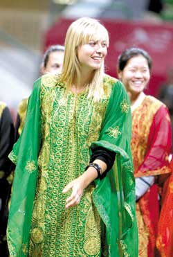 昨天WTA一級(jí)賽卡塔爾公開賽開賽儀式上,參賽女選手身著卡塔爾民族服裝亮相,莎娃在其中更是亮麗出眾。
