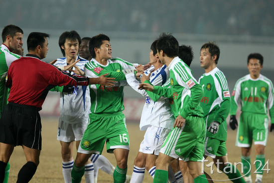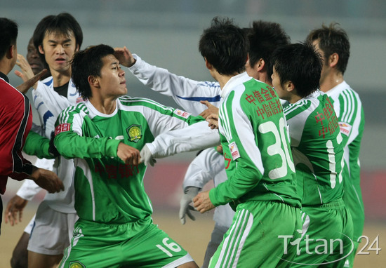 11月12日,北京國安與天津泰達(dá)賽后,雙方爆發(fā)斗毆,黃博文(16號)與對方毆打。