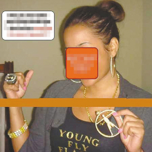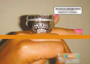 NBA巨星韋德剛剛向好萊塢女星尤尼昂求婚成功,結(jié)果又傳出緋聞。一名少女(上圖)將一組相片寄給網(wǎng)站,稱韋德和她一夜情后感覺很爽,大方地將大堆禮物送給了她,其中包括韋德唯一的總冠軍戒指(上圖)、佩飾金項鏈以及貼身T恤衫等。