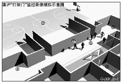 、俦O(jiān)控錄像攝像頭。②星耀籃球場(chǎng)。③客隊(duì)更衣室。④主隊(duì)更衣室。⑤電梯。⑥攝像頭監(jiān)控區(qū)域。⑦走出更衣室的上海隊(duì)球員。