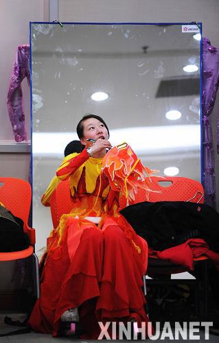 圖為2月8日,一位演員在帶妝彩排間隙休息。