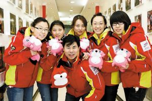 在昨天的網(wǎng)絡聊天現(xiàn)場,這群活潑的姑娘對著話筒唱出對隊長王冰玉的表白:“胖冰胖冰我愛你,就像老鼠愛大米……不對,就像大米愛老鼠……胖冰是1984年生的,屬老鼠!蓖醣駥﹃犛训臒崆榕糜行┐胧植患埃瑵q紅著臉說“我也愛你們”。